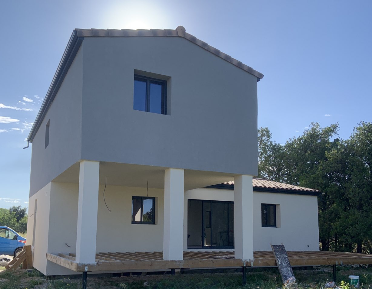 Transformation complète grâce à l’isolation thermique par l’extérieur Sur cette réalisation, une structure initiale en containers maritimes a été métamorphosée en maison moderne et performante sur le plan énergétique. L’enveloppe a été traitée avec une isolation thermique par l’extérieur en laine de bois souple, complétée par des panneaux de laine de bois rigide fixés sur une ossature bois. Ce procédé écologique assure une excellente performance thermique et acoustique, tout en offrant un confort optimal hiver comme été, et en préservant l’inertie de la structure existante. Le résultat : une maison à l’esthétique soignée, durable et éco-responsable.